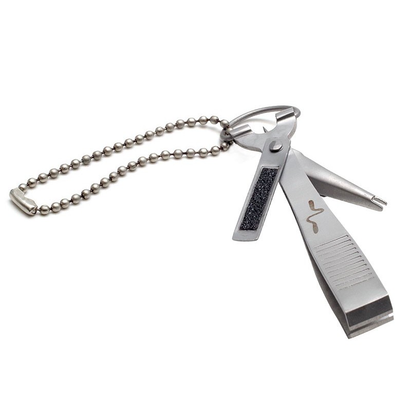 Cortahilos, aguja, herramienta para conectar linea con leader y lima para afilar la punta de nuestros anzuelos.