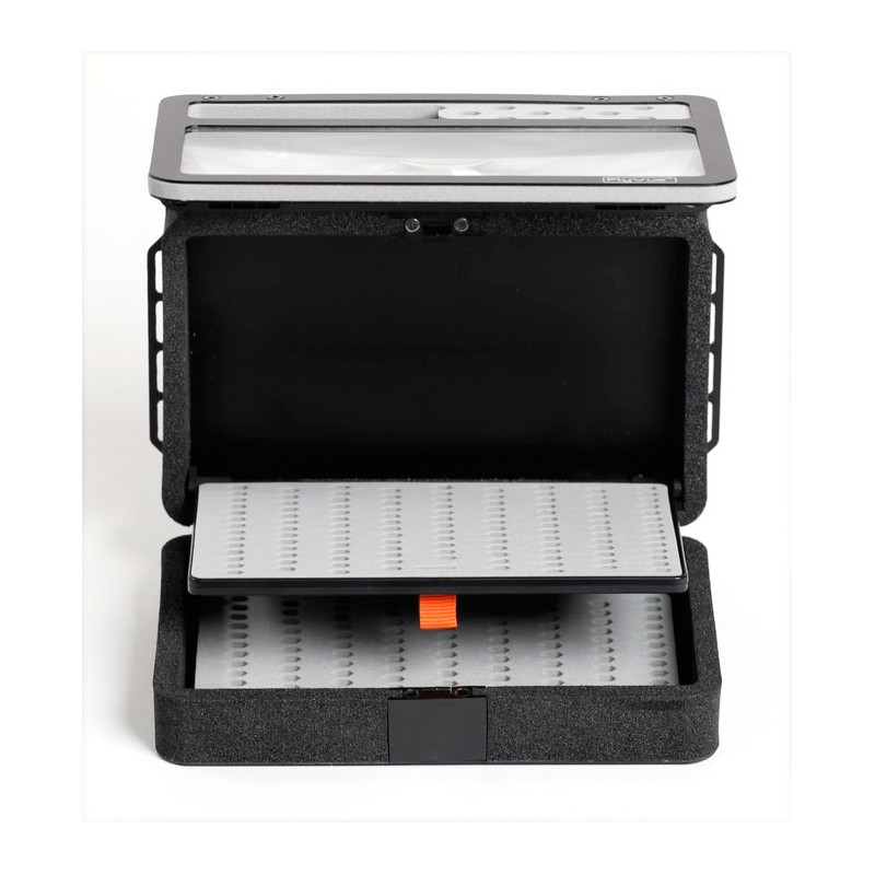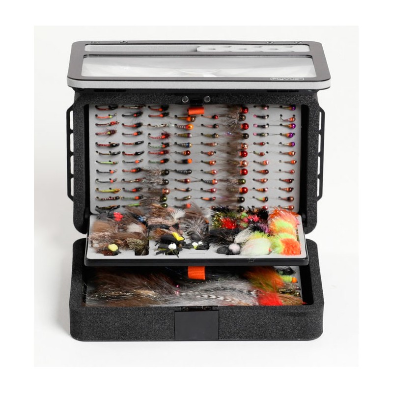 Foam Con ranuras y protecciones laterales, tambien tiene hendiduras laterales para fijar el nylon, ideal para llevar los aparejos de ninfa o tandem ya montados.Con este practico porta bajos podremos llevar hasta 8bajos preparados.Se pueden colocar moscas en las dos caras.