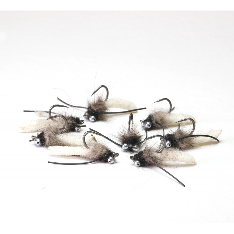La imitacion de gammarus es una de las mejores opciones para pescar cerca de la vegetacion del río, su aspecto natural la hace muy efectiva. Van ligeramente plomados.