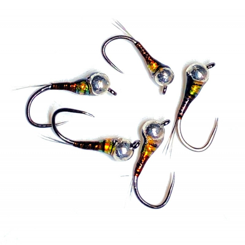Una ninfa que nunca uede faltar en tu caja, la negrina pesca durante todo el año y da muchos peces cuando no sabemos que ninfa montar. Su cabeza negra, collar en iriscente y brinca plata la hace visible e irresistible. Montada con anzuelo Flycreek Tamaño. - Bola tungsteno plus negra de 3.0 mm.