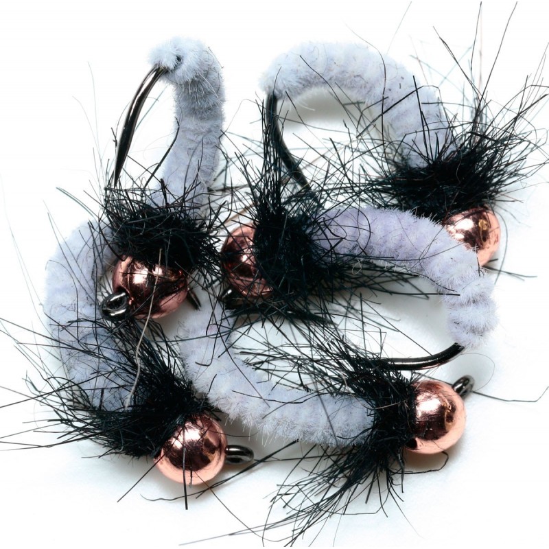 Esta ninfa peluda es una de las mas vendidas y efectivas de la coleccion por su montaje en buitre negro, su saco alar en oreja de liebre y sus patitas en cdc la hacen infalible. Cabeza: Plata en 3.5 y 3 mm.Anzuelo: FC11 en 12 y 14.Bufanda: Liebre natural y cdc.Cercos: Gallo de Leon.Cuerpo: Buitre negro