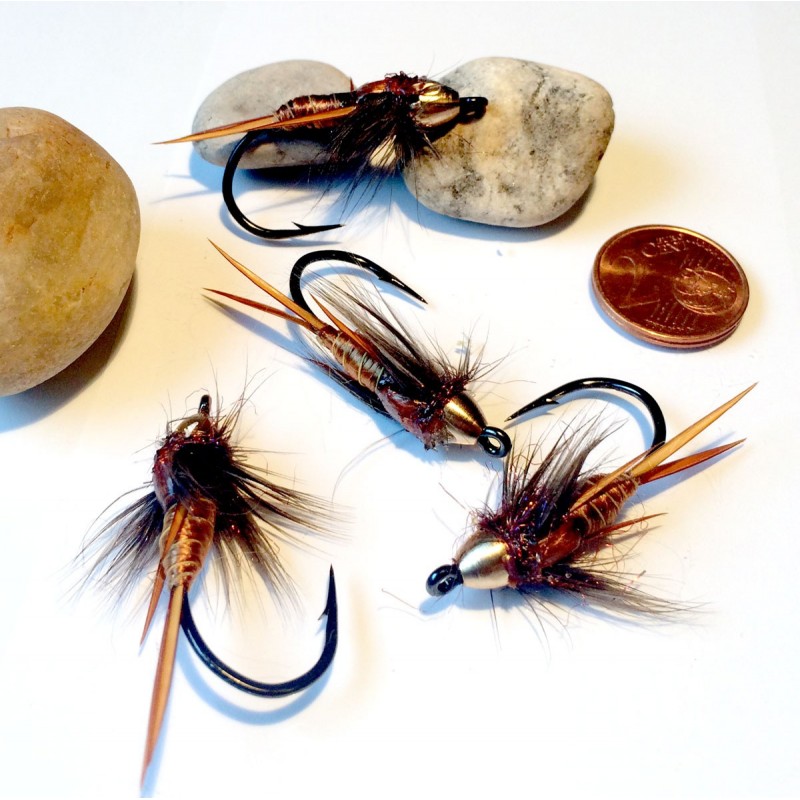 La imitacion de gammarus es una de las mejores opciones para pescar cerca de la vegetacion del río, su aspecto natural la hace muy efectiva. Van ligeramente plomados.