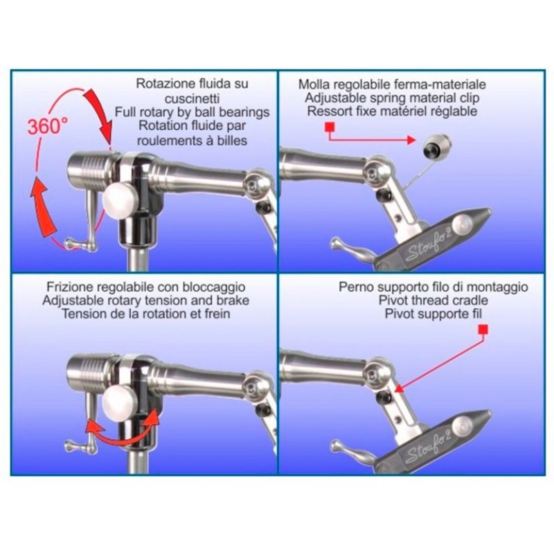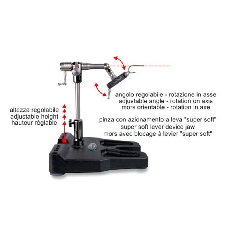 Permite sujetar con firmeza gran numero demateriales, plumas de gallo, plumas de CDC, tinsel,alambres, plomo etc.
