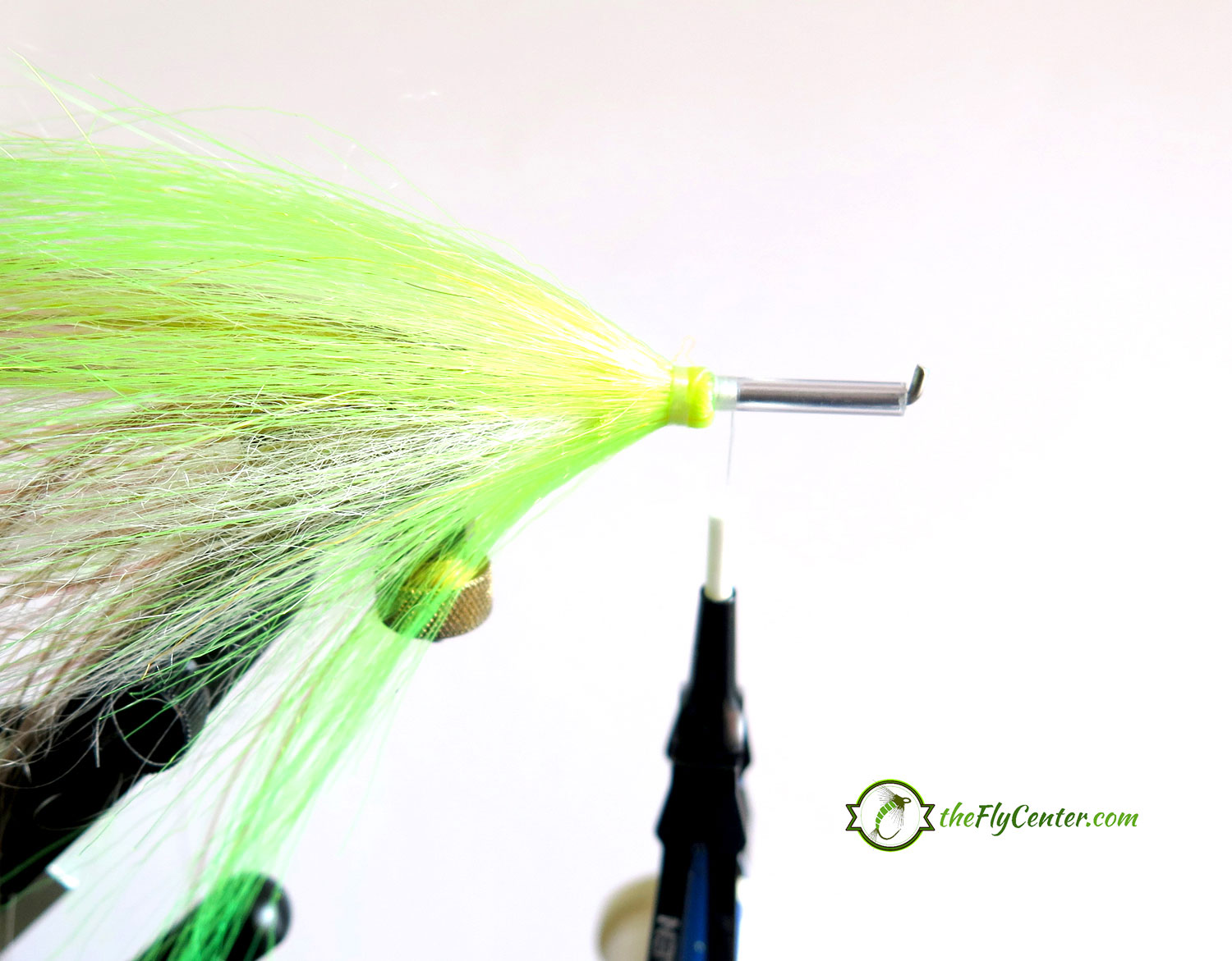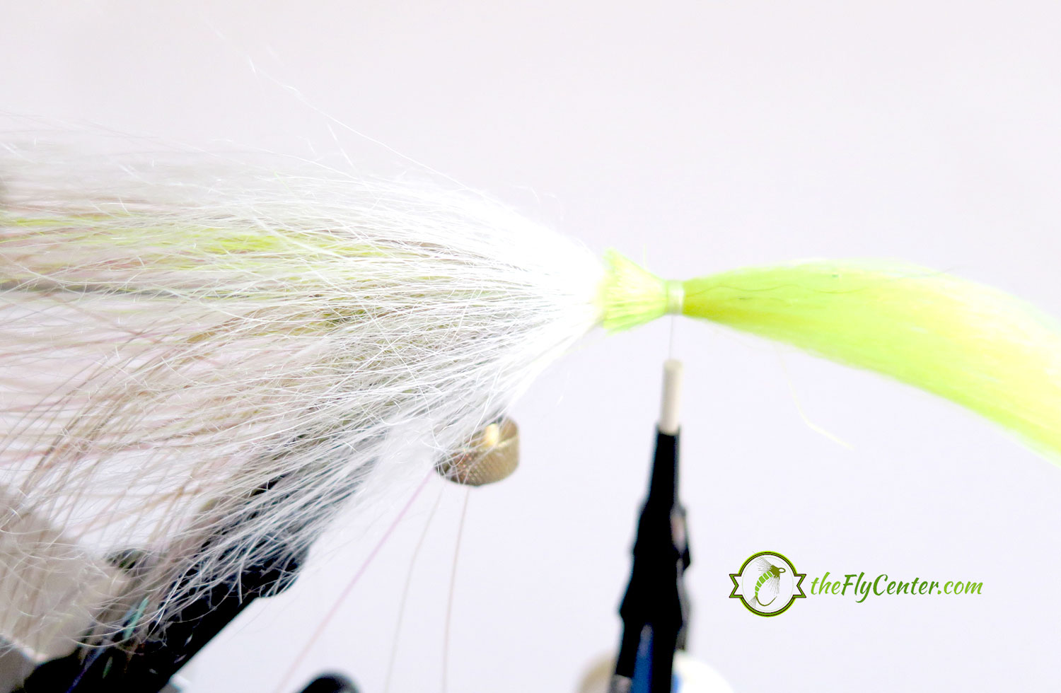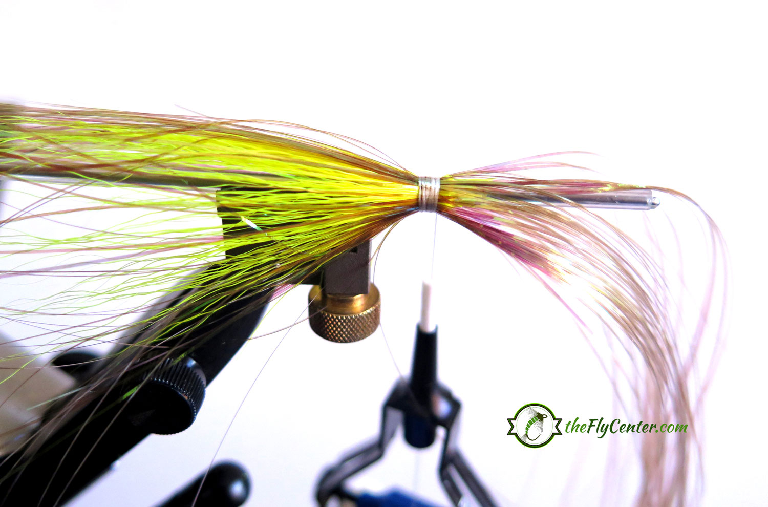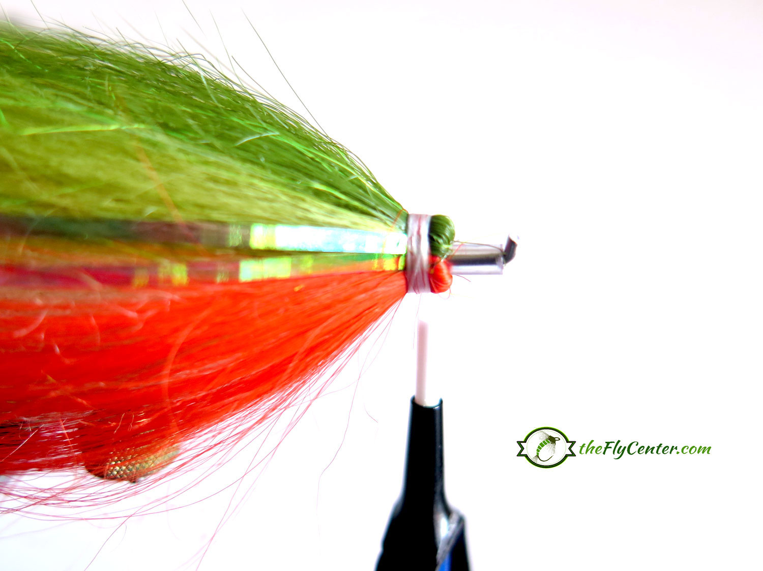 Se colocan las fibras de flash que daran la linea central del señuelo y se realiza el nudo final.