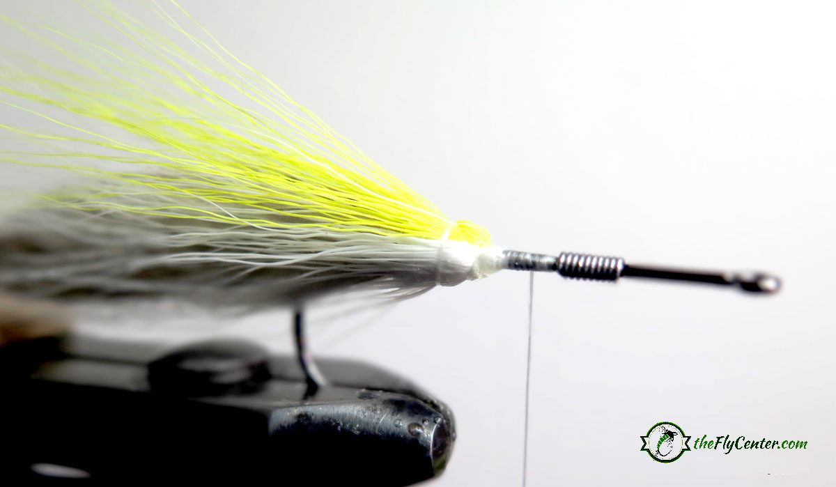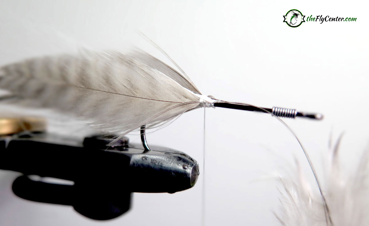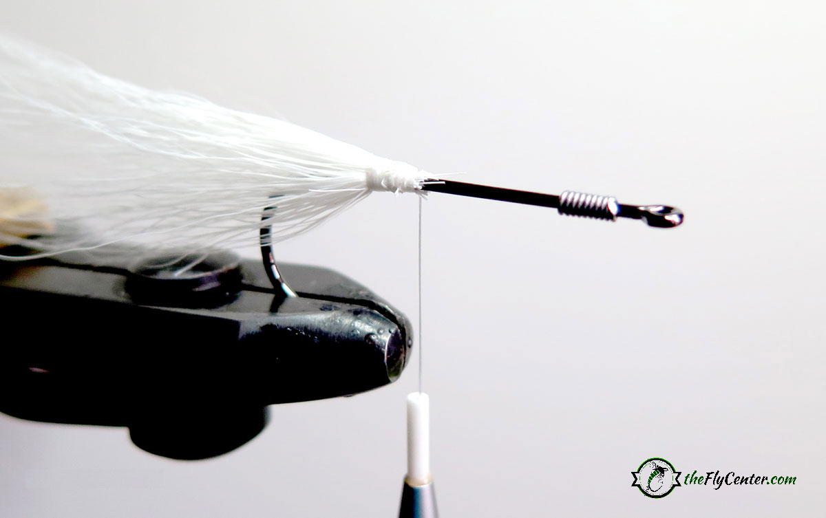 Colocamos el anzuelo añadiendo unas vueltas de hilo de plomo y atamos un mechón de bucktail para ir formando la cola.