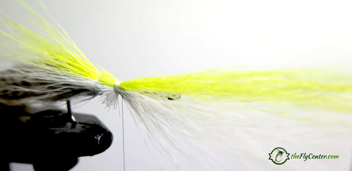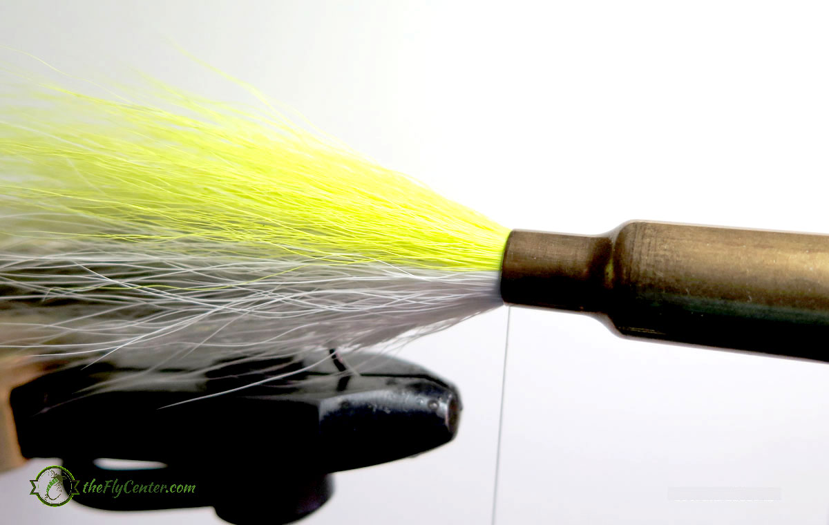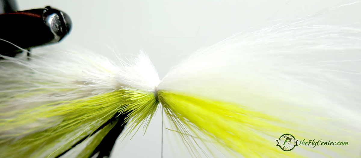 Cortamos dos mechones de bucktail, blanco parte barriga y otro para la parte superior (color a elegir). Atados hacia delante.