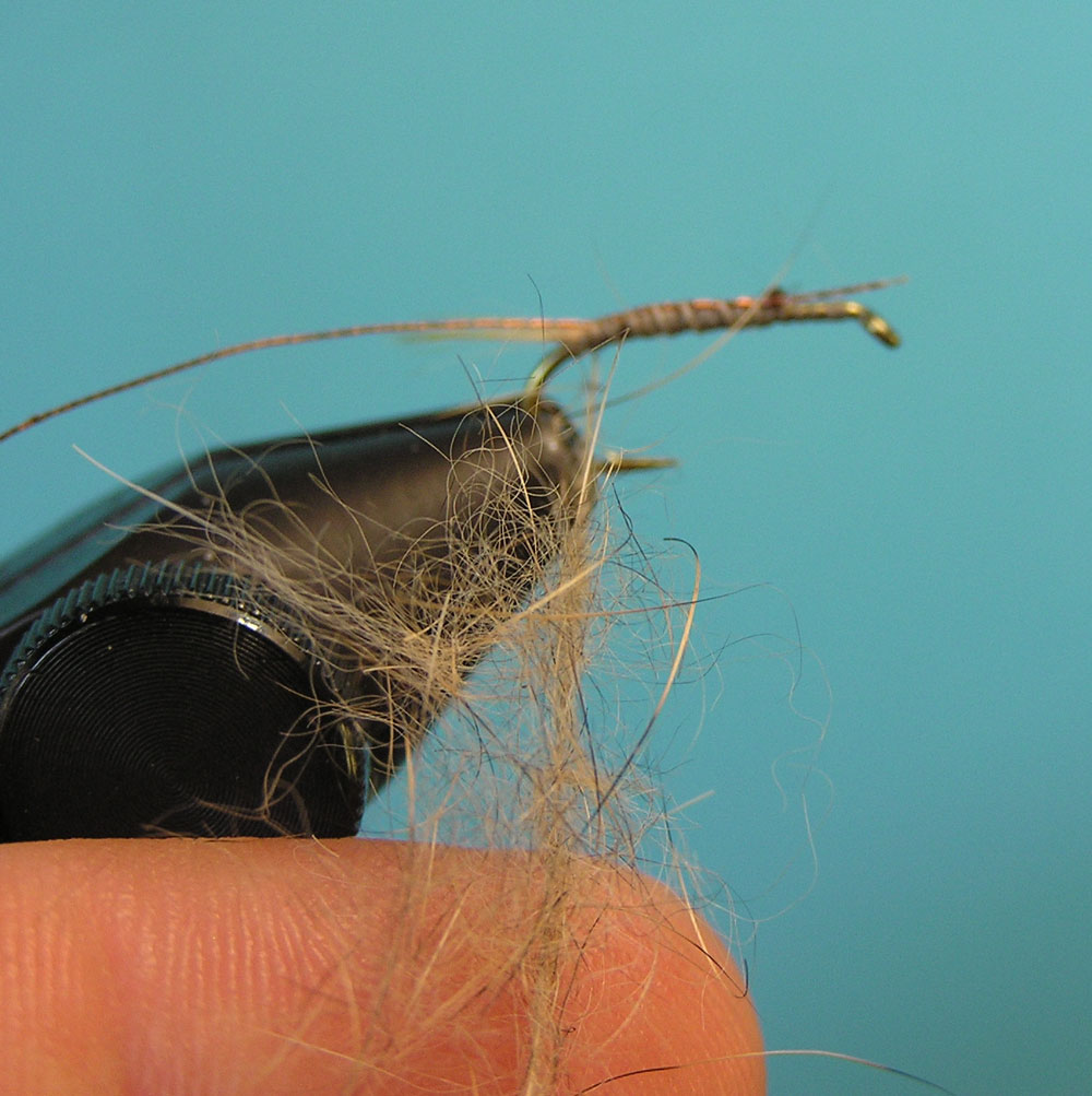 Con ayuda de los dedos de la mano izquierda que colocan cada sección de pluma a uno de los lados de la ninfa, atamos.