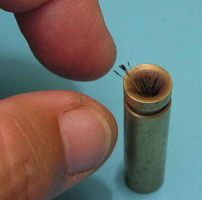 El igualador se golpea contra la mesa de montaje para que en su fondo se depositen las puntas de la pluma.