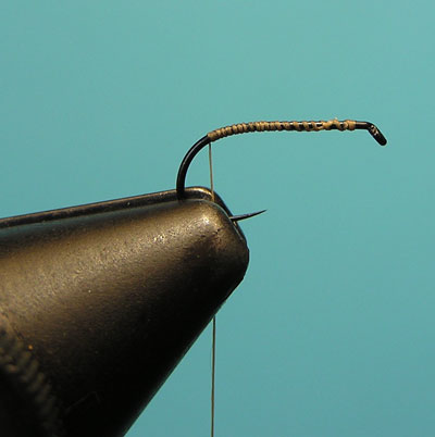 El cuerpo no recubre una pequeña parte del cuello del anzuelo que queda reservado para la colocación de la pluma. Observe que esa parte está cubierta con seda de montaje.