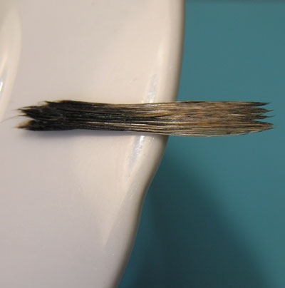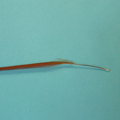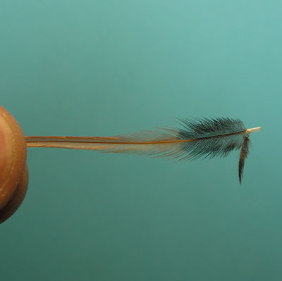 Al arrancar el hackle observara una zona oscura de plumón. Arranque todo lo que no sea pluma y fíjese como uno de los laterales ha sido pelado algo más que el otro.