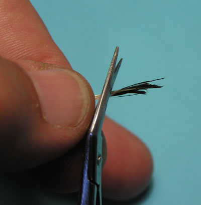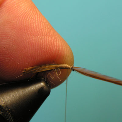 El hackle se prepara para su enrollamiento pelando la parte inferior de la pluma, la que rodará de inmediato sobre el atado de cabeza, de esta forma las fibras no se pisan y no sobresalen aplastadas hacia atrás.