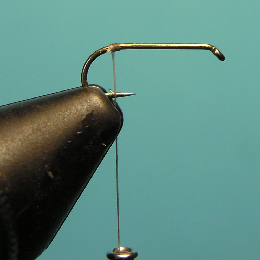 Colocamos el hilo de montaje por debajo del mechoncito que hemos dejado para que al ojo del anzuelo esté libre.
