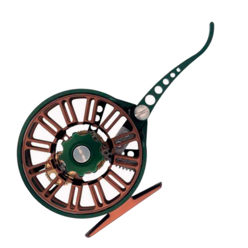 Muy Ligero fabricado en Aluminio 6061 mecanizado, carrete semiautomático.Color anodizado antracita/oliva.Botón de freno micrométrico grande - salida de riel - carrete de eje grande.cambio rápido de bobinafunda de neopreno.